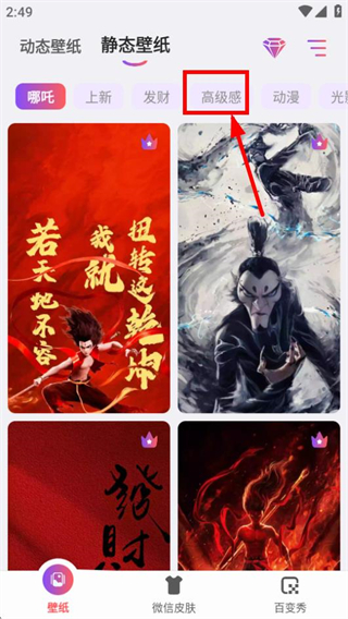 2、在静态壁纸页面,点击高级感标签,可切换到对应风格的壁纸列表。