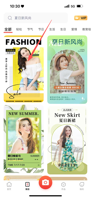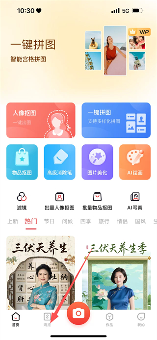 1、在APP首页,点击底部海报,进入海报模板页面。
