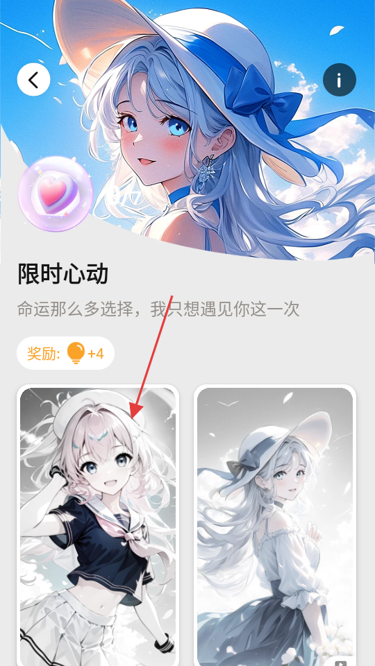 3、在限时心动详情页,选择喜欢的角色形象,进入涂色页面。