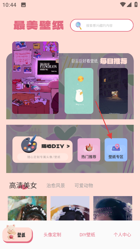 1、点击页面中的壁纸专区选项,进入壁纸专区页面。