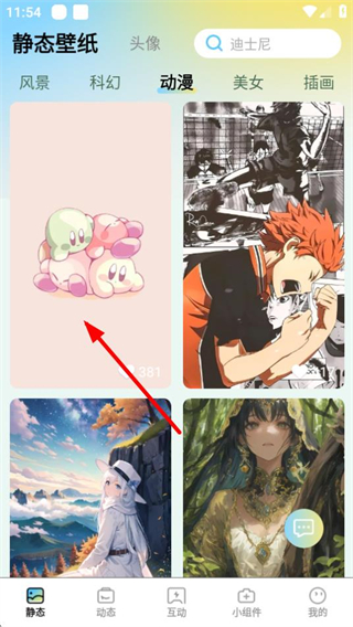1、在静态壁纸页面,点击动漫分类标签,进入动漫类壁纸列表页面。