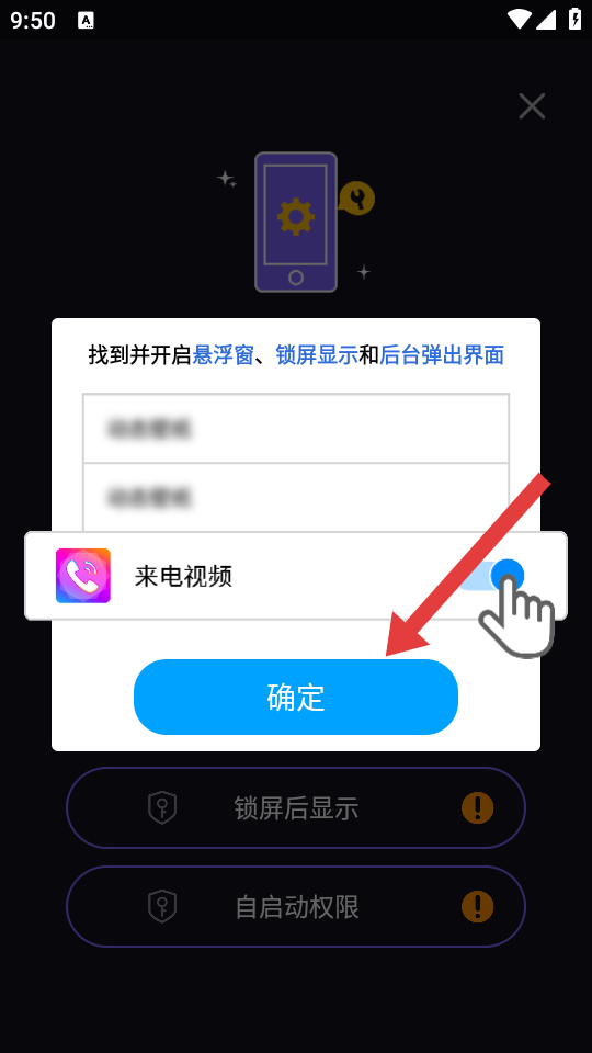 4、在弹出的来电视频权限开启窗口中,开启对应权限后点击确定,即可完成来电秀设置。