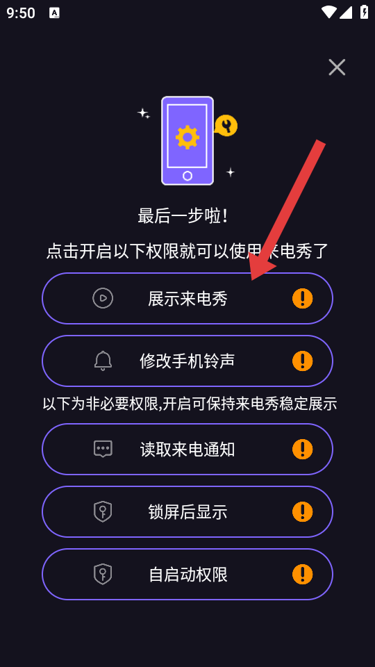 3、在最后一步啦权限提示页面,点击展示来电秀的选项,处理来电秀所需权限。