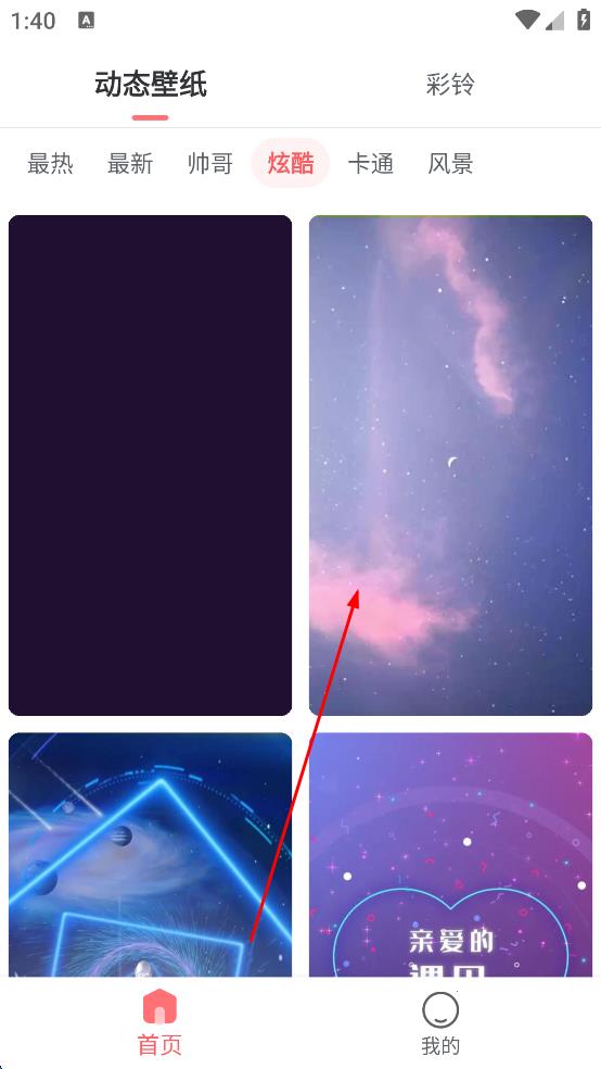 1、进入动态壁纸应用,切换到“炫酷”分类,浏览壁纸列表,点击选中喜欢的星空类动态壁纸。
