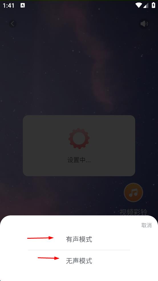 3、在弹出的设置选项中,按需选择“有声模式”或“无声模式”,等待“设置中...”完成,壁纸即设置成功。