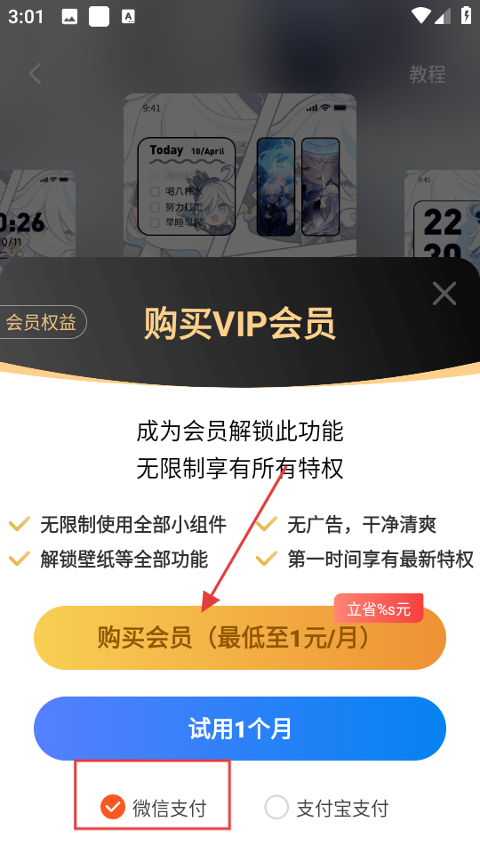4、在购买VIP会员页面,选择购买会员,完成购买后即可继续设置主题。