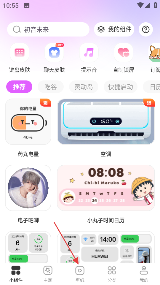 1、在小组件页面,点击底部的壁纸按钮,进入壁纸页面。