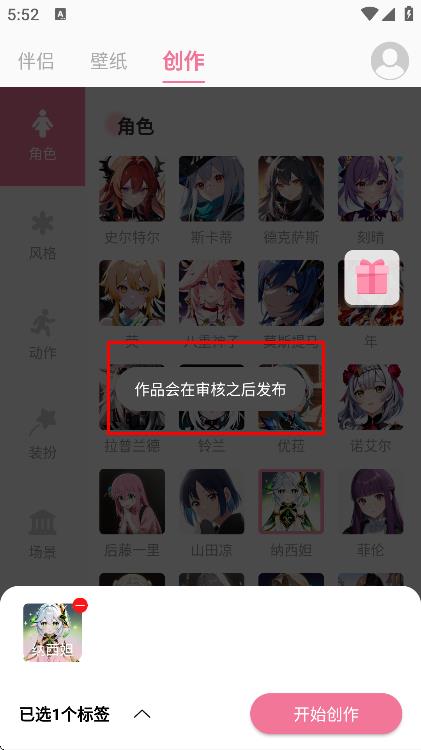 2、在创作页面,选好角色等标签后,点击开始创作,生成作品。