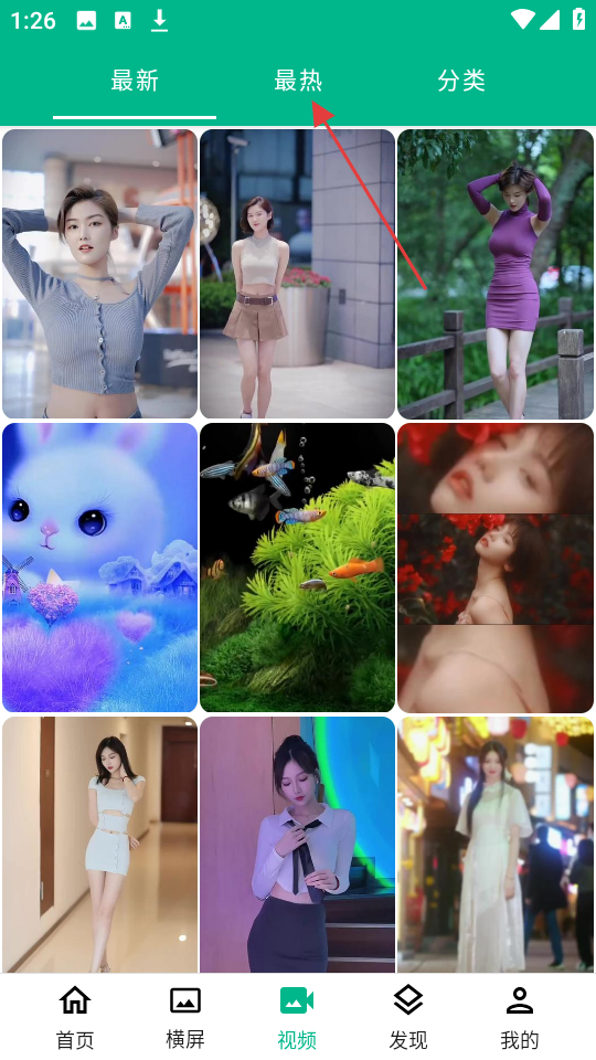2、在视频页面中,点击顶部最热选项,查看最热的视频内容。