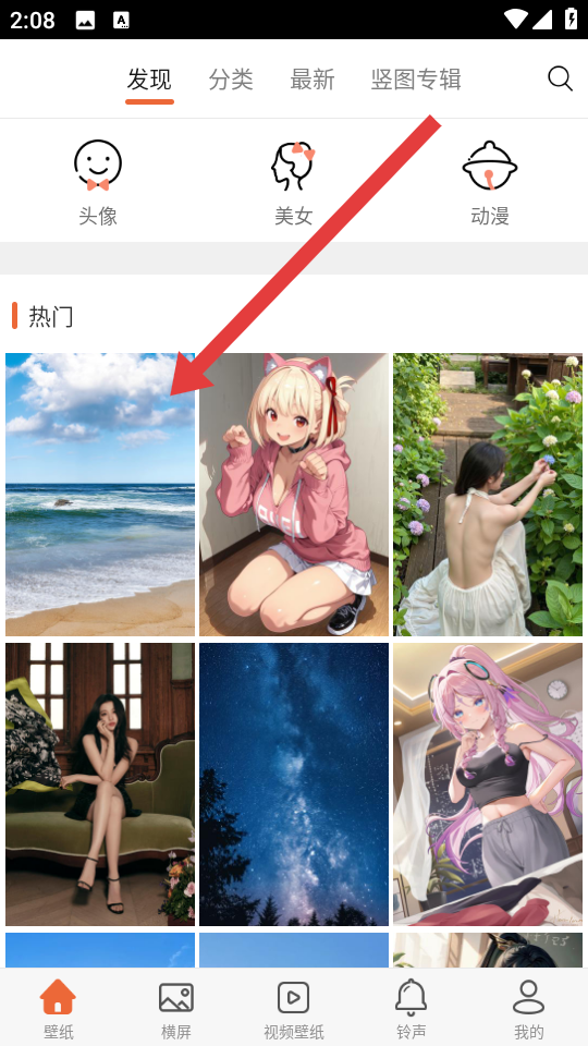 1、打开爱壁纸APP,在发现页面的热门分类中,点击想要设置为锁屏的壁纸,进入竖屏壁纸页面。