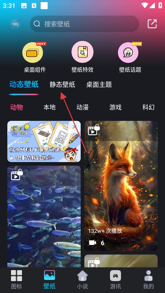 2、进入壁纸页面后,点击静态壁纸选项,可查看静态类的壁纸。