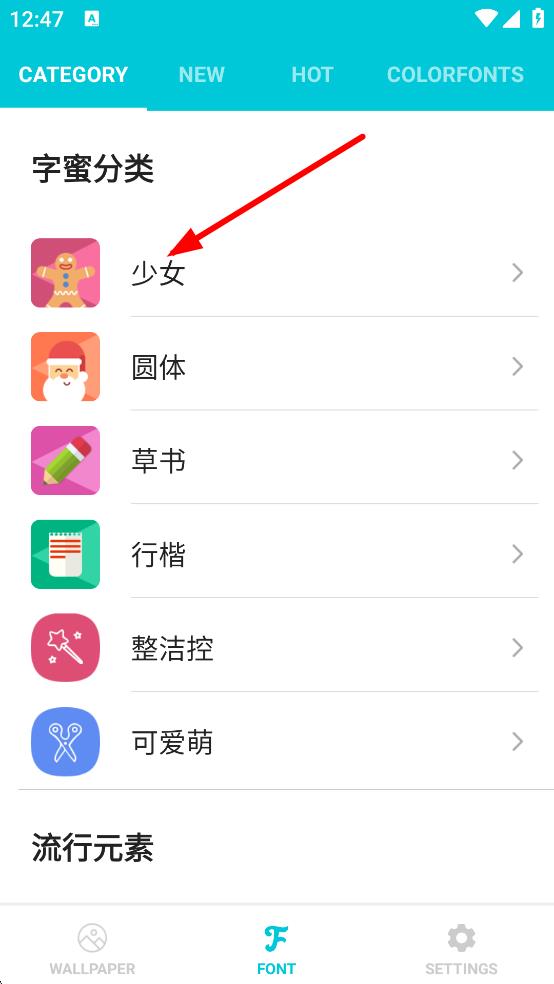 2、在字体分类页面,选择少女分类,查看少女类字体。