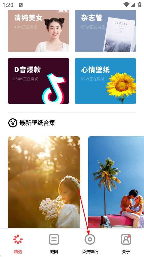 1、打开壁纸软件,点击底部“免费壁纸”选项,进入免费壁纸页面。