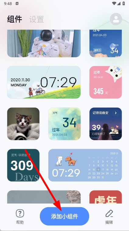 2、在APP主界面,点击添加小组件按钮,进入组件库页面。