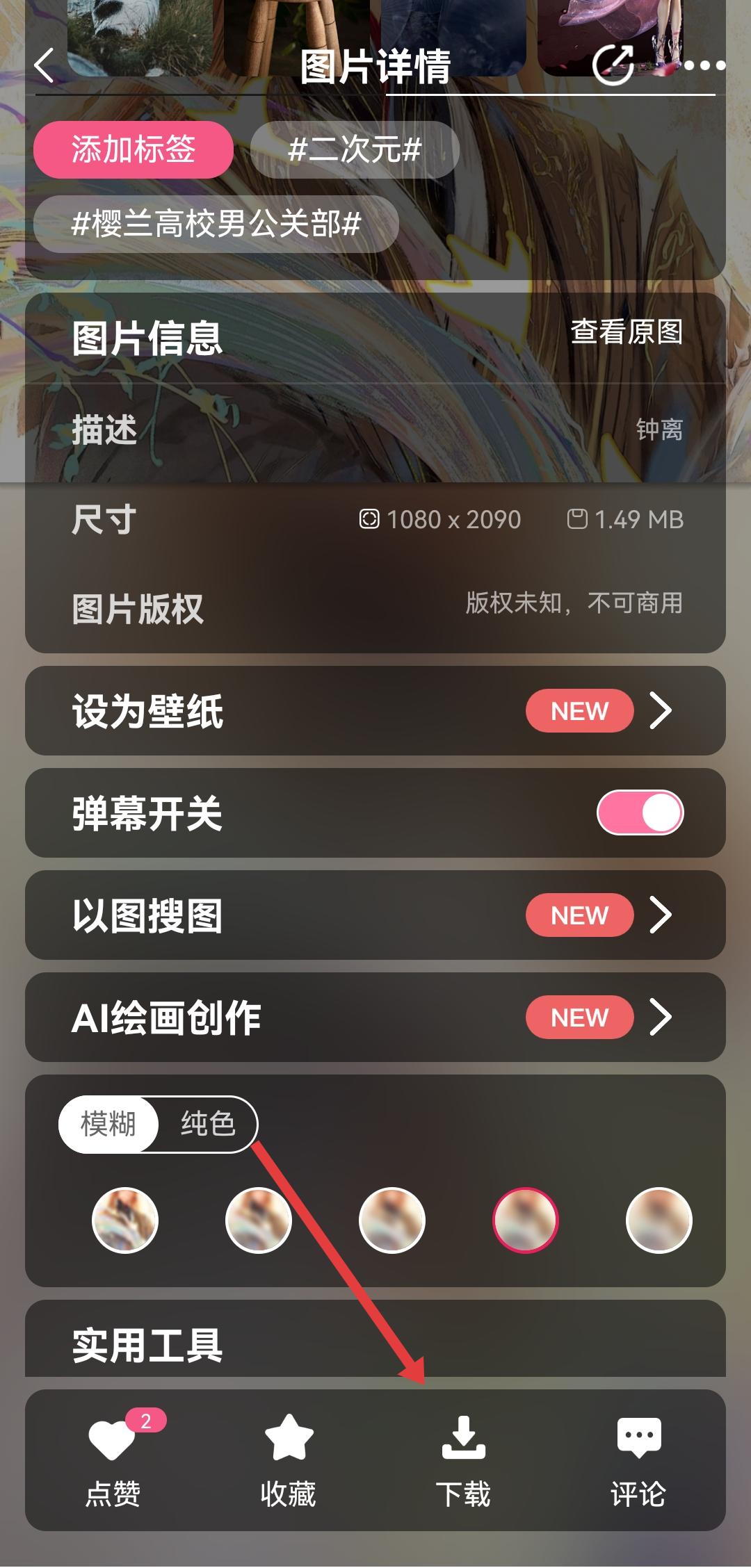 2、在壁纸的详情页面,我们这边可以点击壁纸的任意位置,弹出功能菜单。