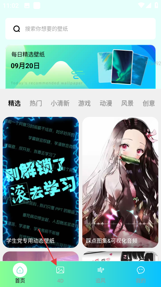 1、在首页,点击底部的4D按钮,进入4D壁纸页面。