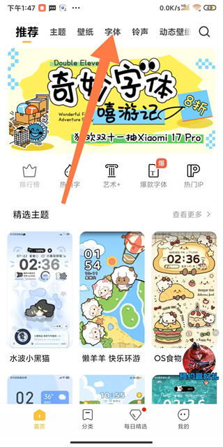 1、在小米桌面APP首页,点击上方字体选项,进入字体页面。