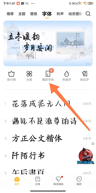 2、在字体页面,点击爆款字体选项,进入爆款字体列表界面。