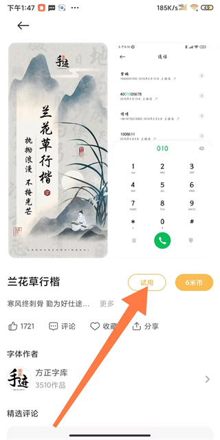 4、在字体详情页面,点击试用或购买按钮,即可完成字体样式设置操作。