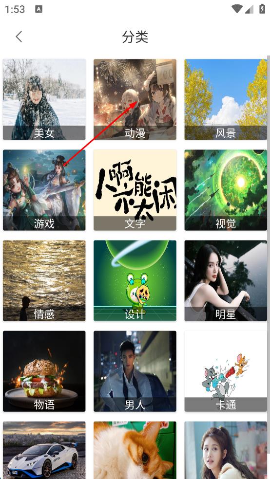 1、进入壁纸软件分类页面,找到自己感兴趣喜欢的分类并点击,进入壁纸列表。