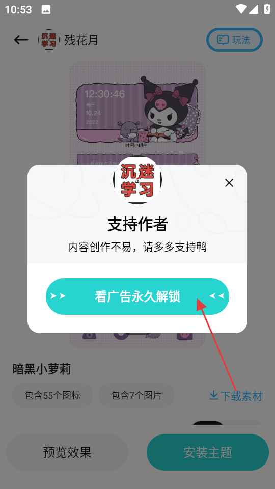 4、在提示框中,点击看广告永久解锁按钮,可解锁并安装该主题。