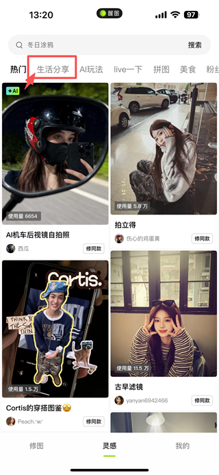 2、在模板推荐页面,点击生活分享分类,浏览生活类模板列表。