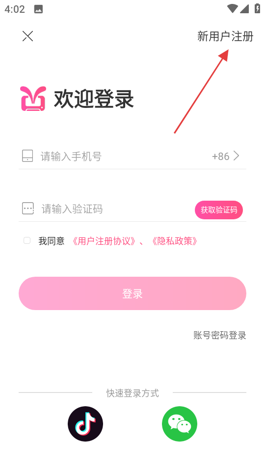 3、在登录页面,点击新用户注册选项,进入注册页面。