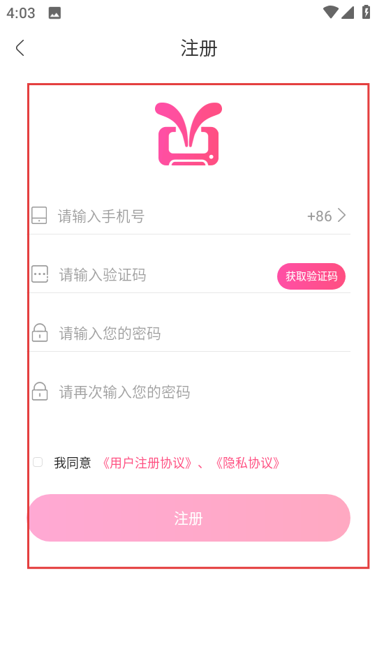 4、在注册页面,依次输入信息勾选协议后,点击注册按钮完成注册。