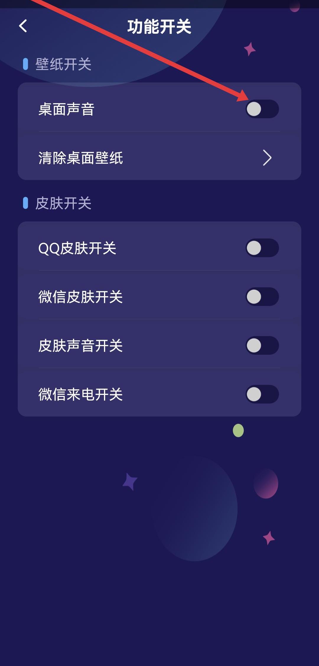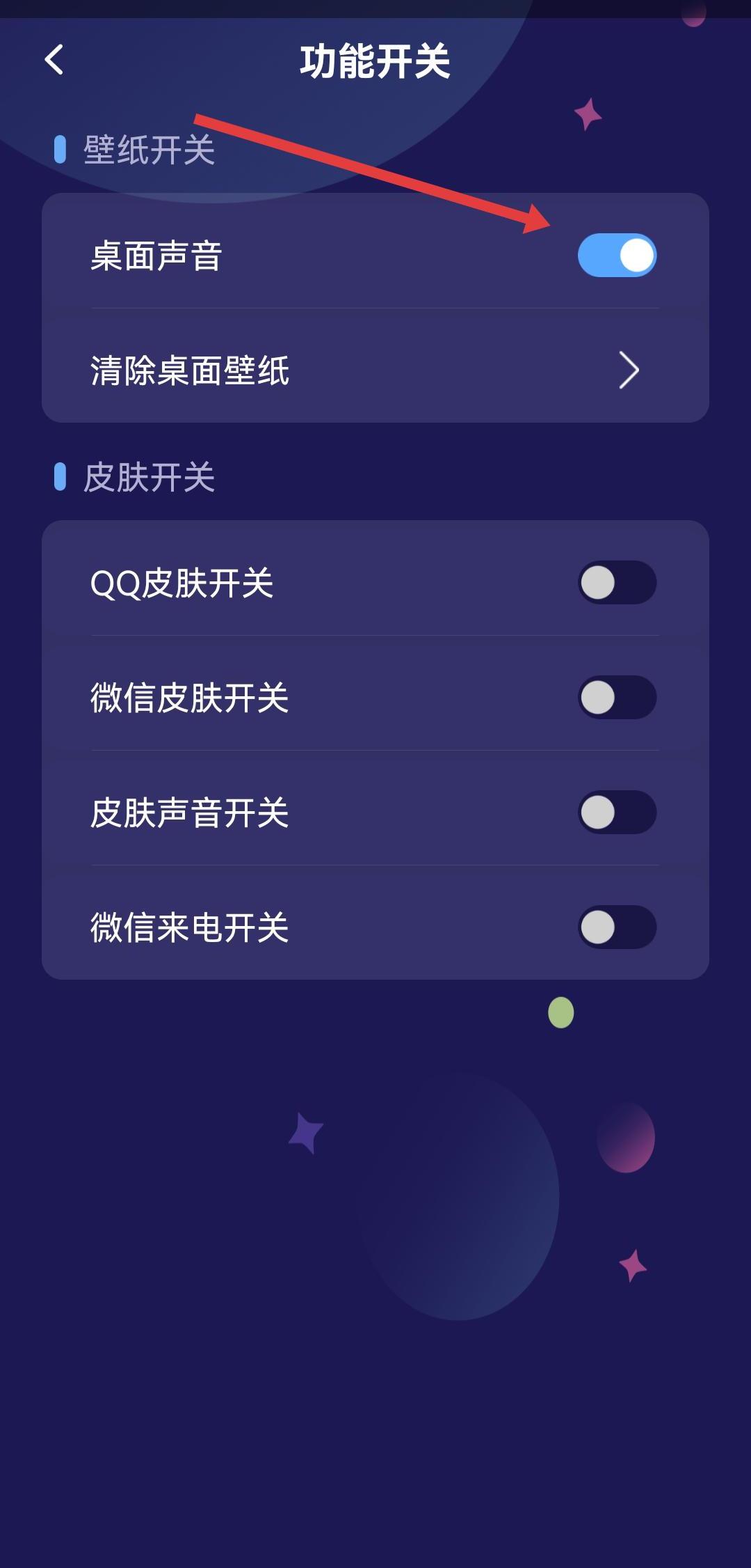 3、在功能开关页面的壁纸开关区域,找到桌面声音选项,点击其右侧的开关。