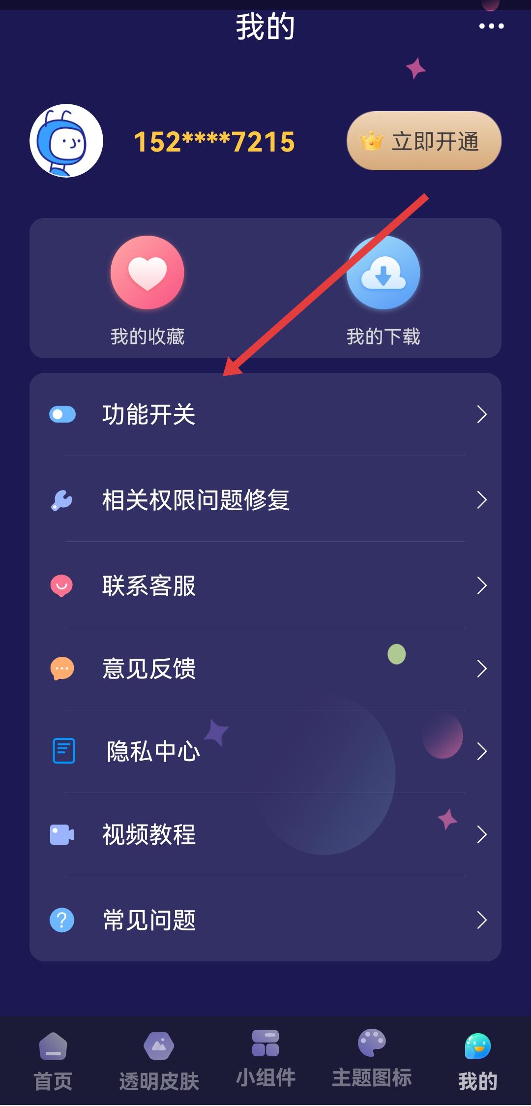 2、在我的页面中,找到功能开关的选项并点击,进入功能开关设置页面。