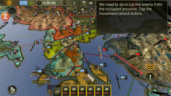 2、根据引导,选中己方部队后,点击右下角移动/攻击按钮,选择敌方占领的省份发起行动,完成对目标区域的夺占,推进战局进度。