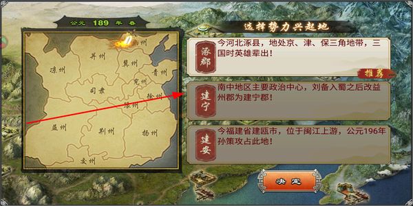 1、玩家开局在地图选择势力兴起的出生地,点击决定按钮确定选择,开启在对应区域的发展。