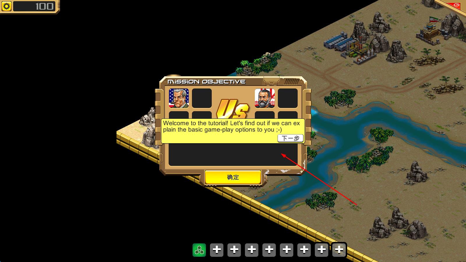1、进入沙漠风暴后,点击任务模式,从首个解锁任务开始挑战,任务目标为打败所有敌军,点击确定进入任务界面,先熟悉屏幕上坦克、基地等核心元素的基础操作。