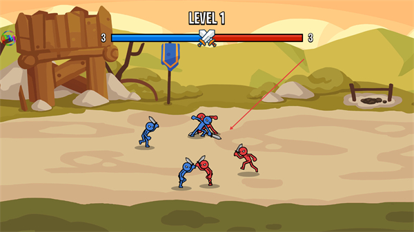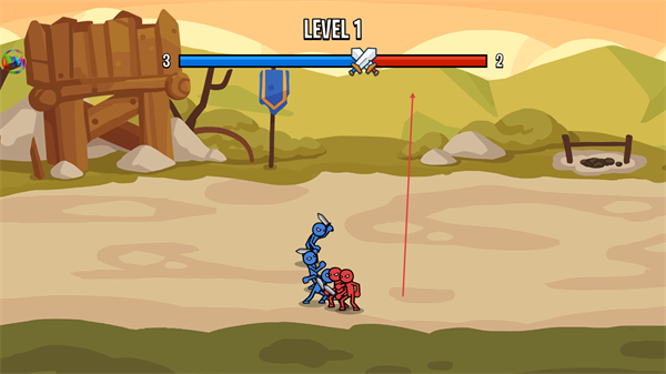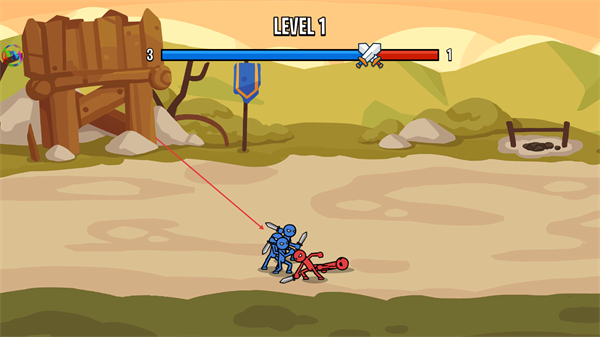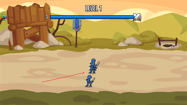 1、进入LEVEL1,操控蓝色火柴人部队攻击红色敌方单位,削减敌方数量。