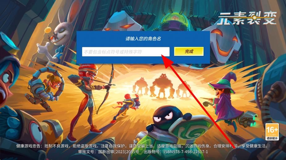 1、首先进入游戏,在角色名输入界面,输入心仪的角色名,确保不包含标点符号或特殊字符,输入完成后点击完成,开启在元素裂变的冒险。