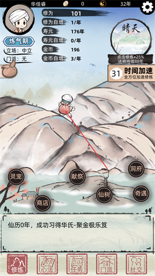 3、利用时间加速功能,快速推进时间,积累修为等资源。