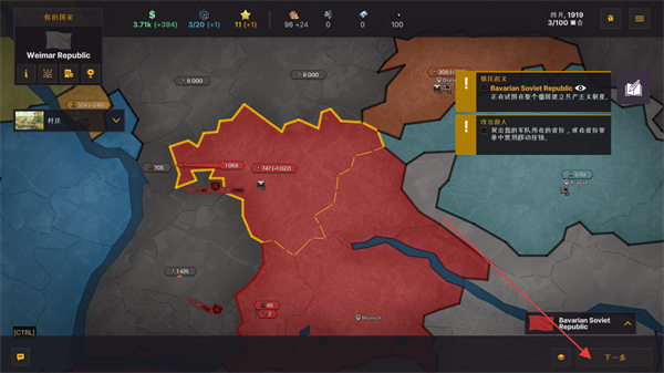 2、观察红色占领区域,查看敌方BavarianSovietRepublic信息,点击下一步。