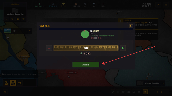 4、在增加招募界面,消耗10322资金招募86兵力,点击增加招募完成操作。