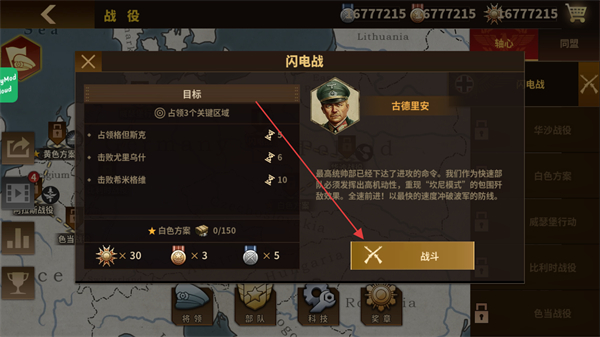 1、在战役界面选择闪电战关卡,点击战斗按钮进入战场。