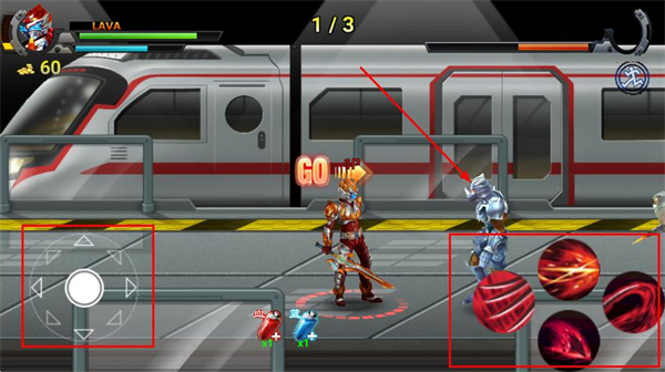 3、战斗场景中,通过左侧虚拟摇杆控制铠甲勇士移动,借助右侧的技能按钮释放招式,与敌人对战推进关卡进度。