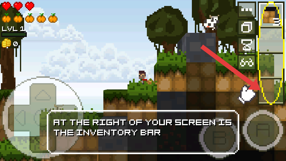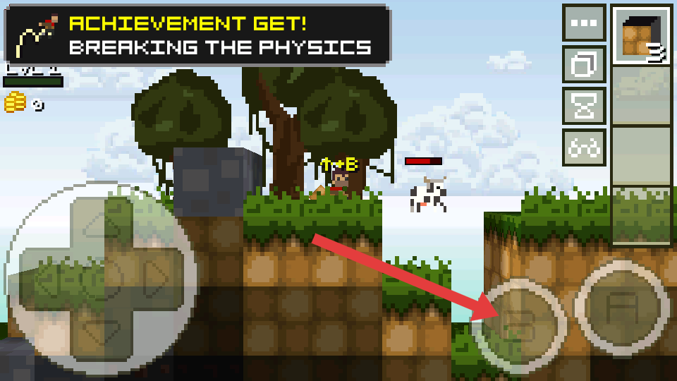 2、在方块下方,按住箭头指向的A按键,进行挖掘操作,可获取方块资源或开辟新的空间,用于收集材料等用途。