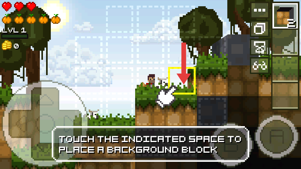 1、按照提示,触摸箭头指向的指定区域,放置背景方块,以此来构建或修改游戏场景,为后续探索和互动创造基础环境。