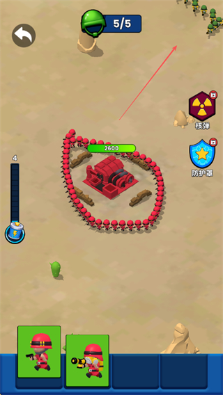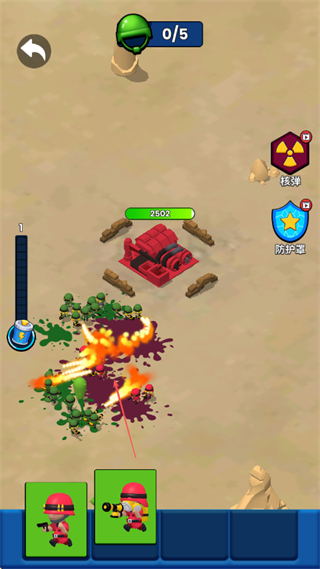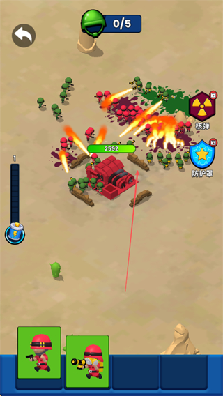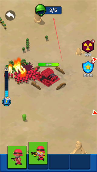 2、敌方发起攻击时,利用火箭炮兵种发射火焰攻击,大范围消灭绿色小兵。