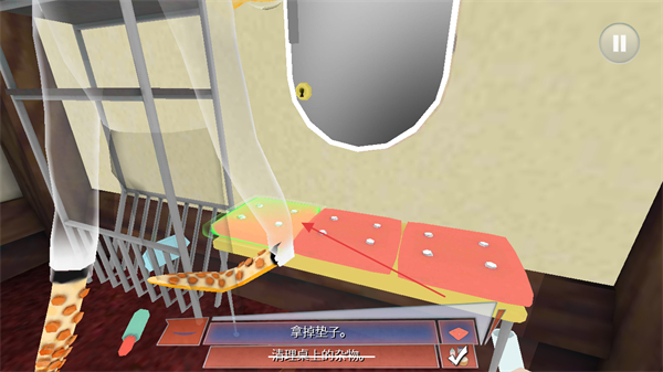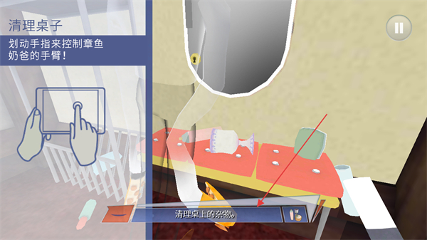 1、划动手指控制章鱼奶爸手臂,清理桌上杂物,完成清理桌子任务。