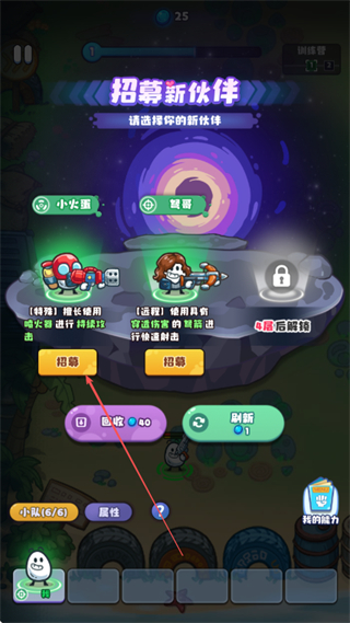 3、点击招募按钮,选择新伙伴如小火箭,增强战斗能力。