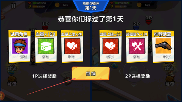 4、成功撑过一天后,可选择奖励如血量提升、武器耐久增加等,点击继续进入下一天,持续生存下去,完成我撑30天到来的挑战。