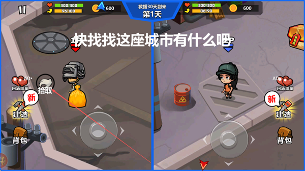 1、在城市中探索,拾取物资如装备、金币,点击拾取按钮收集资源,为生存和战斗做准备。