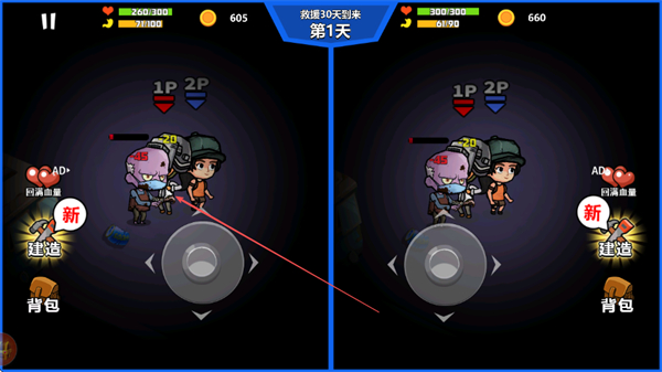 2、夜晚会遭遇丧尸攻击,与队友2P协同作战,共同消灭丧尸,注意躲避攻击,保持自身血量。