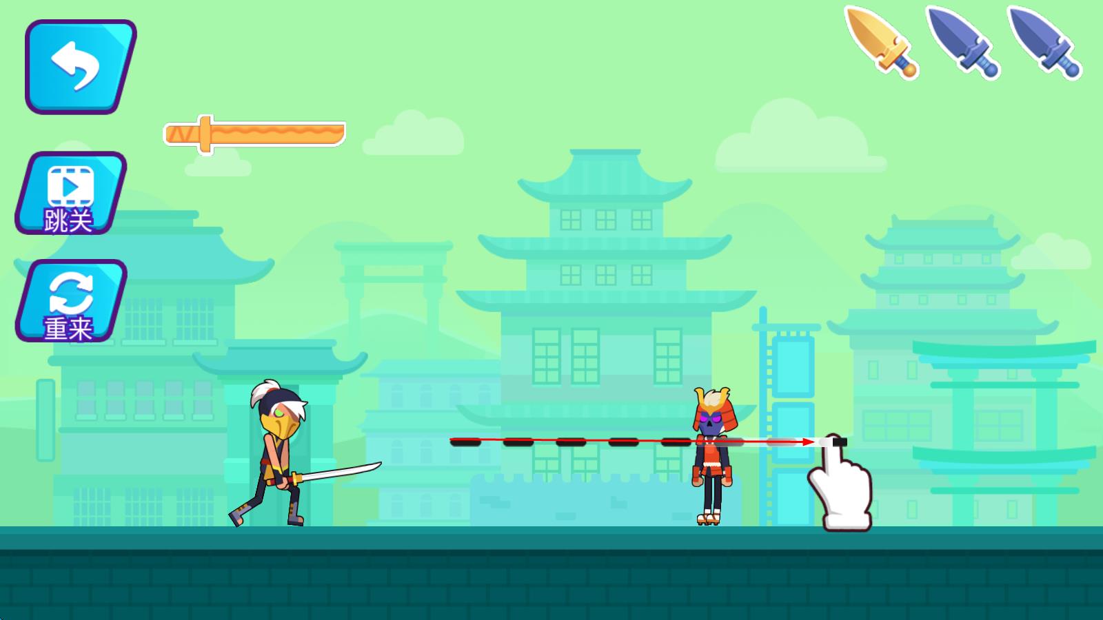 2、游戏中途,面对愈发复杂的关卡与数量增多的敌人,灵活调整移动路线,利用环境优势锁定目标,力求以最少出刀次数消灭敌人,避免生命值损耗。