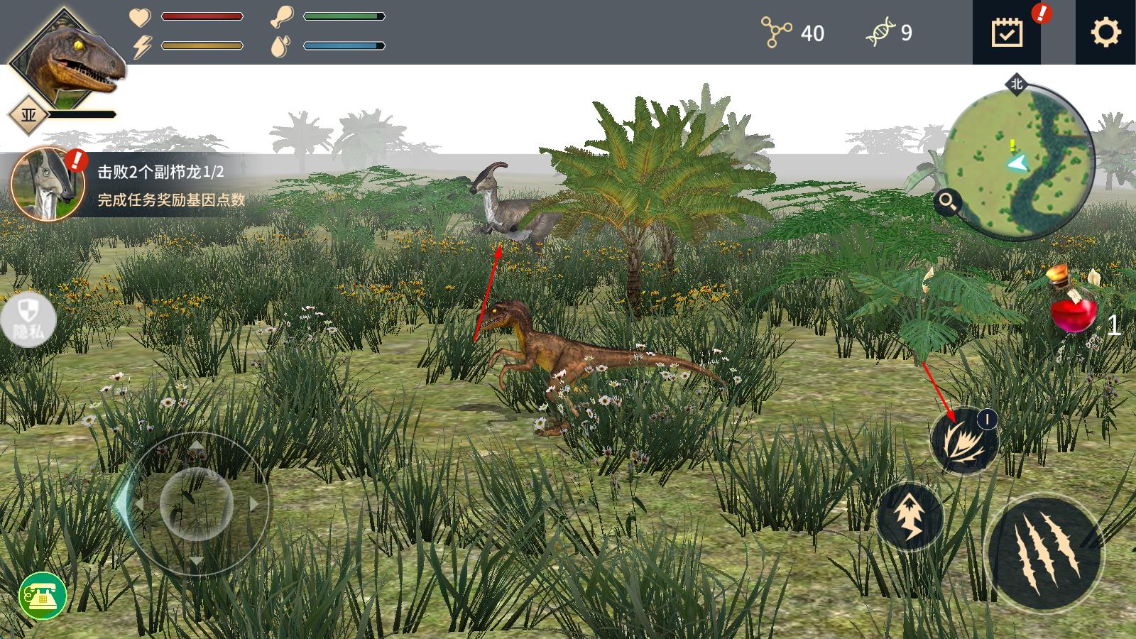 2、生存过程中,迅猛龙需捕食其他恐龙获取经验与进化值,副栉龙则靠食用植物升级,同时留意周围环境,躲避天敌攻击,逐步积累实力为进化做准备。